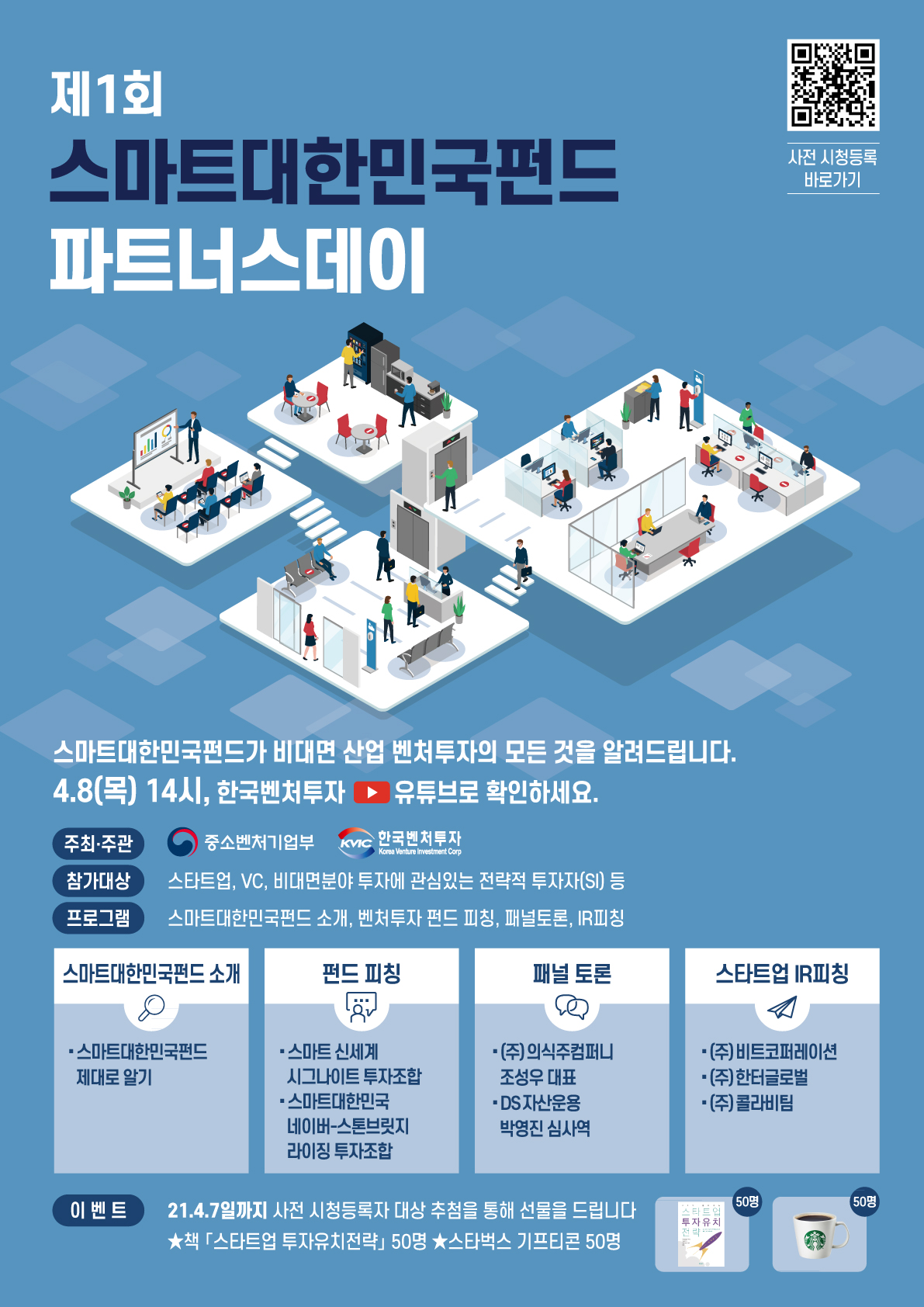 스마트대한민국펀드가 비대면산업 벤처투자의 모든 것을 알려드립니다. 2021년 4월 8일 14시, 한국벤처투자 유튜브에서 확인하세요 사전시청등록 이벤트도 놓치지 마세요! - 내용 : 사전시청등록자 중 추첨을 통해 책<스타트업 투자유치 전략> 또는 스타벅스 기프티콘 증정 - 이벤트 URL : https://forms.gle/xBpWogc1UUCE4mXV8 - 참여기간 : ~4.7(수)까지